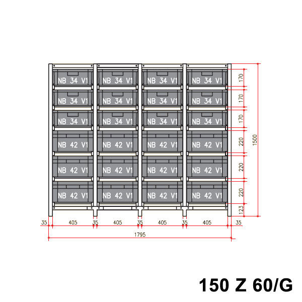 | Typ 150 Z 60/G | Rozměry Š × H / V (mm) 1795 × 600 / 1500 | Počet nádob NEWBOX 12 ks NB 42 V1, 12 ks NB 34 V1 | |